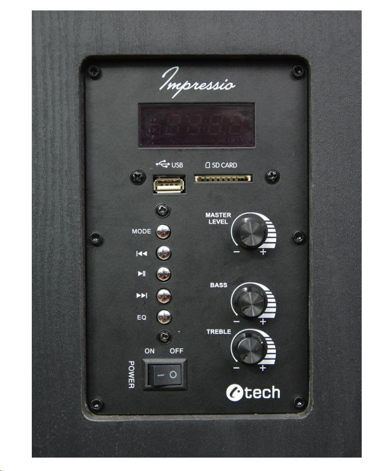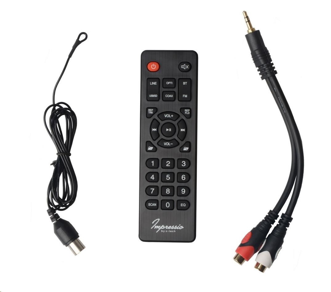 V pohodlí Vašeho obývacího pokoje asi nebudete sedět přímo u reproduktoru, proto budete častěji k jeho ovládání používat dodaný dálkový ovladač. Ten zvládne většinu funkcí, jako je: upravení hlasitosti, volba skladby nebo FM stanice, spuštění a přerušení přehrávání, nebo volbu zdroje zvuku mezi Bluetooth, FM rádiem, pamětí USB, nebo SD kartou a LINE-IN vstupem, optickým a koaxiálním vstupem.