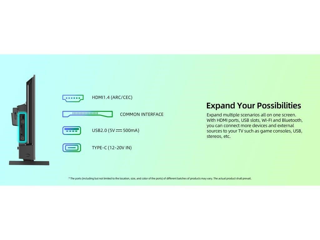 Vstupy a výstupy: USB-C, AV vstup mini, CI+, sluchátkový vstup 3.5 mm, digitální audio výstup, HDMI 1.4, ARC CEC, USB 2.0, LAN, antény RF a LNB