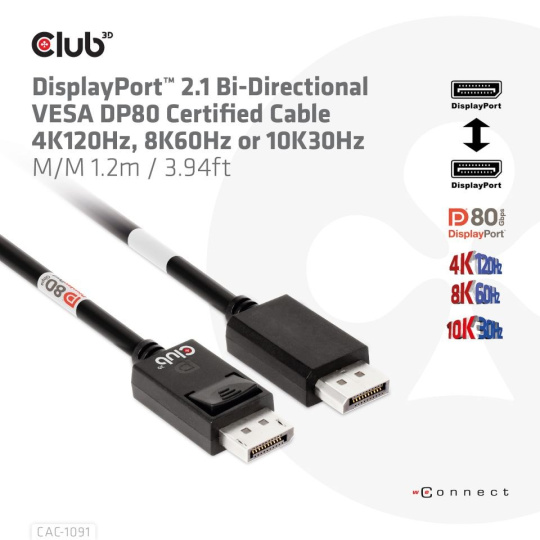 Kabel Club 3D CAC-1091 DisplayPort™ 2.1 umožňuje připojení vašeho (herního) PC nebo notebooku s podporou DisplayPort™ k (Ultra) monitoru s vysokým rozlišením nebo jinému zařízení s podporou DisplayPort™. DisplayPort™ 2.1 UHBR10/13.5/20 až 80 Gb/s, má také podporu pro Display Stream Compression 1.2 (DSC), Forward Error Correction a rozšiřuje maximální počet vložených audio kanálů na 32. Disponuje uzamykatelnými konektory DisplayPort™ zajišťujícími bezpečný , spolehlivé spojení, s NOVÝMI kontaktními prsty speciálně navrženými pro tyto vysoké rychlosti. Jednoduše stiskněte vestavěné jednodotykové tlačítko pro odemknutí konektoru. Měkký plášť UltraFlex chrání kabel před ohybem a poškozením deformací.