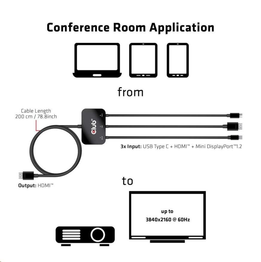The Club 3D CAC-1630 is a perfect solution for any meeting room. This adapter will let you connect laptops/tablets/phones that support HDMI™, MiniDP™1.2 and / or USB Type C* video ports to your HDMI™ 4K60Hz ready projector, TV or monitor.