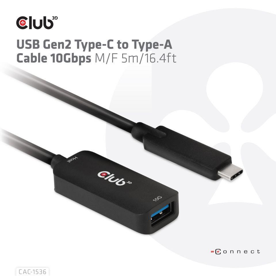 The Club 3D CAC-1536 USB Gen2 Type-C to Type-A Cable 10Gbps M/F 5m/16.4ft cable connects your Notebook, Tablet or Phone with USB Type-C output to your favorite existing Peripherals, Accessories and Chargers featuring the common USB Type-A plug. It enables Data and Power over a single cable and both ways. This cable supports USB 3.2 Gen 2. SuperSpeed+ data up to 10Gbps and up to 900mA output for Downstream charging or powering your USB Type-A enabled Notebook, Tablet or Smartphone.