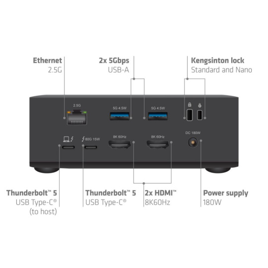 | Výstup | 1x Thunderbolt 5 2x HDMI 2x USB-C 3x USB-A 1x MicroSD/SD 1x Ethernet 1x 3.5mm Jack 1x M.2 |