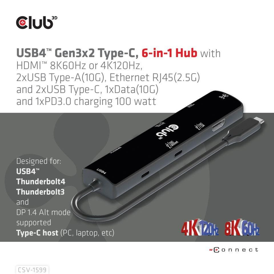 The Club 3D CSV-1599 is a USB4™ Gen3x2 Type-C, 6-in-1 Hub with HDMI™ 8K60Hz or 4K120Hz, 2xUSB Type-A(10G), Ethernet RJ45(2.5G) and 2xUSB Type-C, 1x Data(10G) and 1xPD3.0 charging 100 watt, this adapter is offering an integrated solution for video, data, power and Ethernet. It has a HDMI™(8K60Hz) for video transmission, 3 USB data ports (2 USB-A 10G, 1 Type-C 10G)for data transmission, a 2.5Gbps Ethernet port for surfing on line. Besides, this adapter is equipped with Type-C PD3.0 Charging port with max 100W power supply. It can work on USB4™, Thunderbolt4, Thunderbolt3 and DP Alt mode (15W is dedicated to the functioning of this product, the rest power(max 85W) will be passed to charge for the host. This 6-in-1 Hub will work on all DP Alt mode supported Type-C hosts.