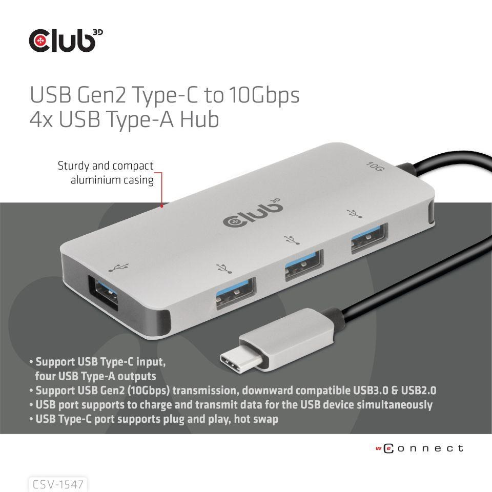 The Club 3D CSV-1547 is an USB Gen2 Type-C to four USB Type-A ports hub, which adds four common USB Type-A ports to your USB Type-C 10G enabled device for Data and Charging. It can work on any Type-C host ( PC, notebook, tablet, Mobile phone,etc). Works with all major Operating Systems.