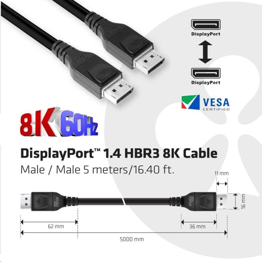 Club3D Kabel certifikovaný DisplayPort 1.4, HBR3, 8K60Hz (M/M), 5m, 28 AWG
