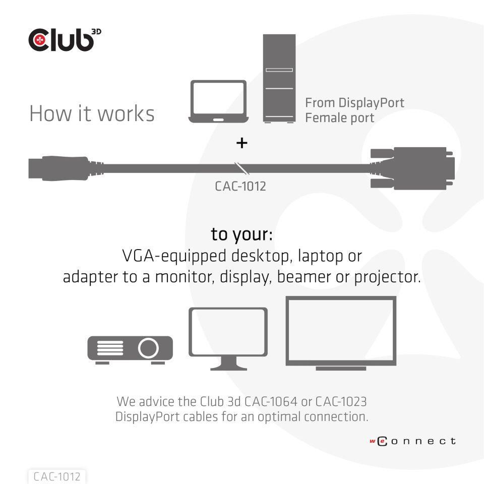 The Club 3D CAC-1012 DisplayPort™ to VGA Cable M/M 2m/6.56ft 28AWG links any DisplayPort™-equipped desktop, laptop or adapter to a monitor, display, beamer or projector with a 15-pin VGA Female port. Ideal for at home or work, the cable creates a reliable connection for anything from gaming to video projection and supports up to Full HD 1080p(max. resolution of 1920 x 1080). A Micro USB port is also provide for External Power. This quality DisplayPort™ to VGA cable provides superior performance thanks to the combined effect of its Gold plated connectors and 28 AWG conductors. Internal shielding provides reduced crosstalk, suppresses noise, and helps prevent electromagnetic interference (EMI) and radio frequency interference (RFI).Experience a reliable, high-quality connection with this convenient DisplayPort™ to VGA 2m/6.56ft cable.