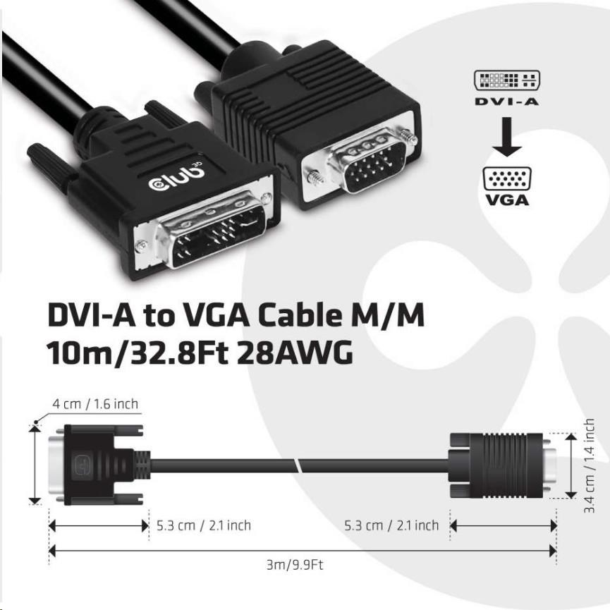The Club 3D CAC-1243 is a DVI-A Male to VGA Male Cable. This cable is Unidirectional. This CAC-1243 Cable is the easiest solution for connecting your VGA Monitor, Projector or Television to the DVI-A output of your PC / Notebook / Game Console.