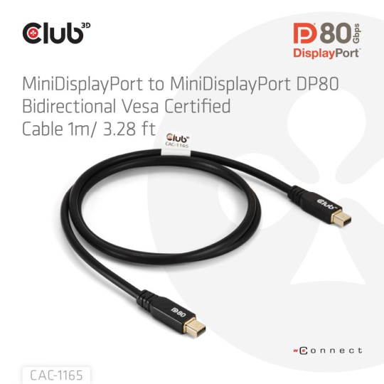 Club 3D CAC-1165 MiniDisplayPort DP80™ koaxiální kabel Certifikovaný kabel Vesa, 4K240Hz, 8K60Hz nebo 10K60Hz 1m umožňuje připojení vašeho (herního) PC nebo notebooku s podporou MiniDisplayPort k monitoru s ultra vysokým rozlišením nebo jinému zařízení s podporou MiniDisplayPort.