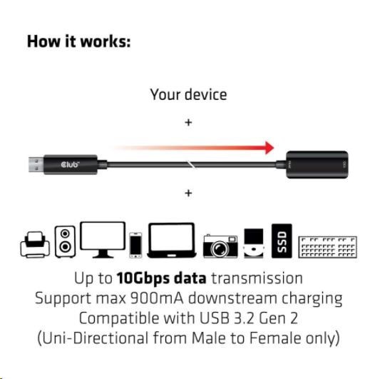 The Club 3D CAC-1411 is an USB Type A extension cable for extending and enhancing USB Signal up to 5m / 16.4 ft. It is compatible with USB 3.2 Gen 2 with a maximum of 10Gbps data transmission. Its downward compatible with lower versions, please note that specifications will be limited to the device connected.