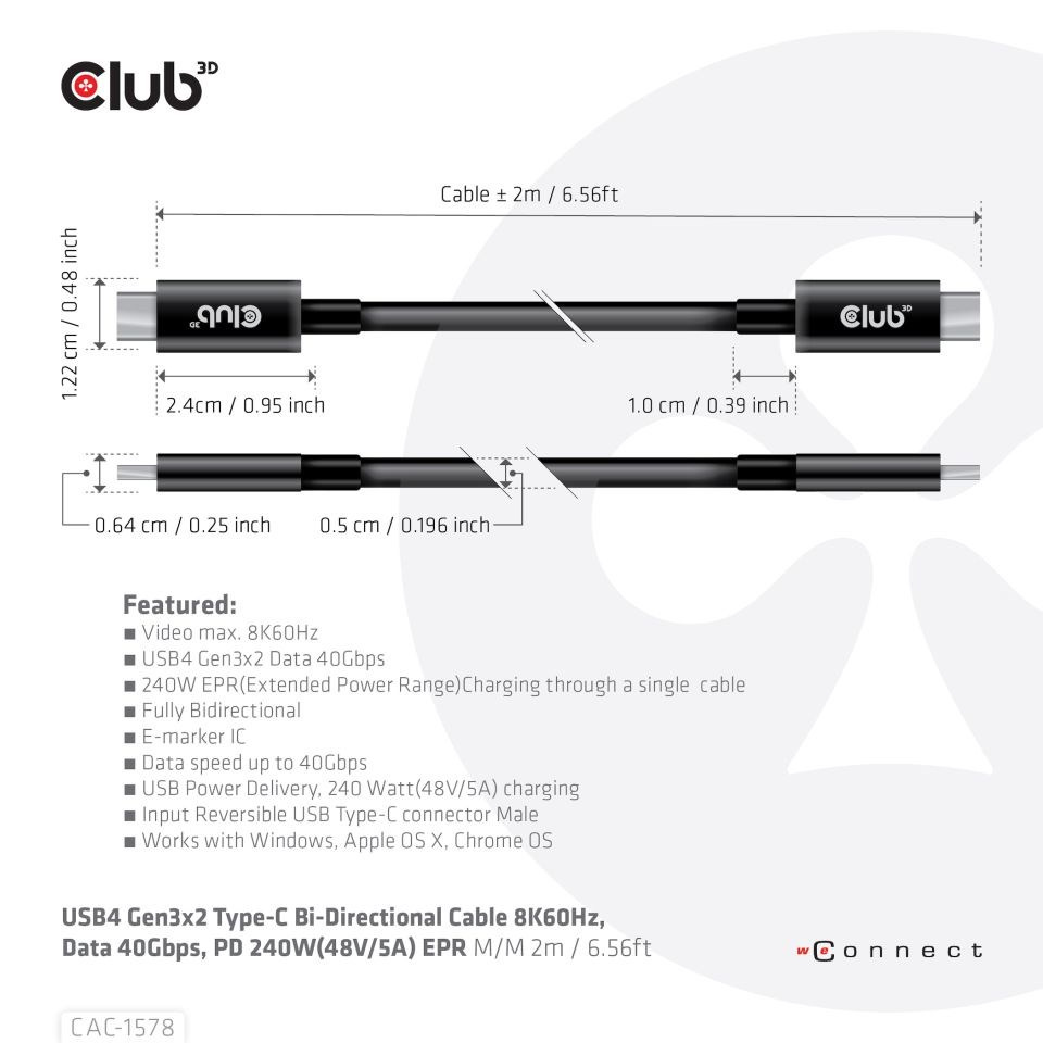 Club 3D CAC-1578 USB4 Gen3x2 Type-C obousměrný kabel 8K60Hz, Data 40Gbps, PD 240W(48V/5A) EPR M/M 2m / 6,56ft připojí váš notebook, tablet nebo telefon s výstupem USB4 Type-C k vašemu oblíbené stávající periferie, příslušenství a nabíječky. Umožňuje video, data a napájení přes jediný kabel a oběma způsoby. Tento kabel podporuje USB4 Gen3x2 Type-C obousměrné video 8K60Hz, Data 40Gbps, PD 240W(48V/5A) EPR M/M 2m / 6,56ft výstup pro downstream nabíjení nebo napájení vašeho notebooku, tabletu nebo smartphonu.