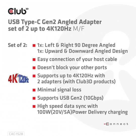 | In the box | CAC-1528 USB Type-C Gen2 Angled Adapter set of 2 up to 4K120Hz M/F |