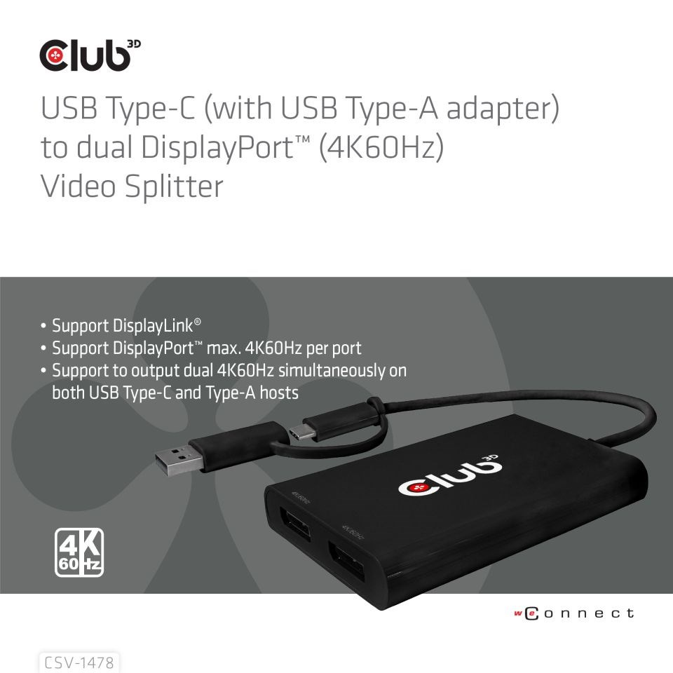 Club3D Video rozbočovač USB-C (USB-A adaptér) na 2xDP 4K60Hz Video splitter