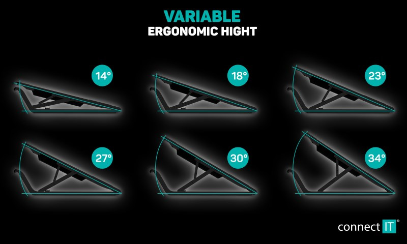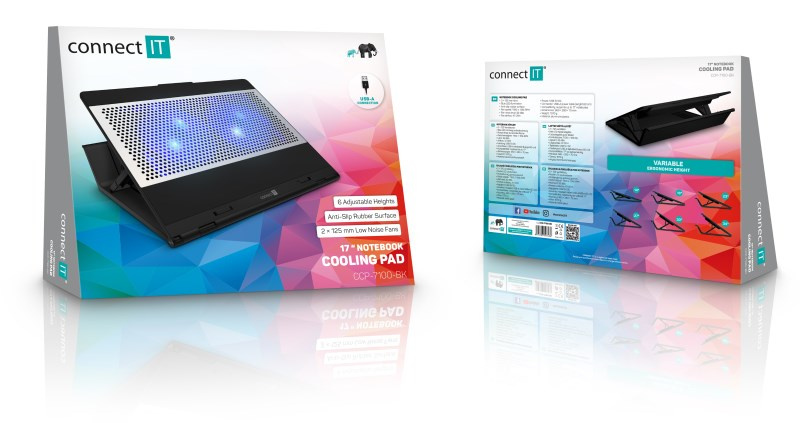 Chladicí podložka pod notebook CONNECT IT "FrostCool" CCP-7100-BK, která je vybavená dvěma ventilátory s modrým LED podsvícením, hliníkovou chladící mřížkou a výškovým šestistupňovým polohováním. Kompatibilní s notebooky do 15,6".