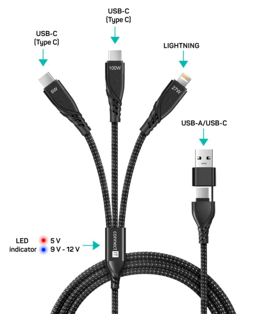 Univerzální nabíjecí kabel 6v1 pro nabíjení zařízení s konektory 2x USB-C,1x Lightning se vstupním konektrom USB-C a redukcí na USB-A. Umožňuje nabíjení až tří zařízení současně s podporou rychlého nabíjení pomocí max. proudového toku 5 A. Speciální manžetová nadstavba konektorů zaručuje lepší přístupnost k nabíjecím zdířkám mobilních telefonů v pouzdrech.
