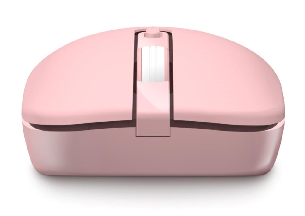 Bezdrátová klávesnice a optická myš v elegantním růžovém designu, určena pro domácí i profesionální použití v kancelářích a firmách.