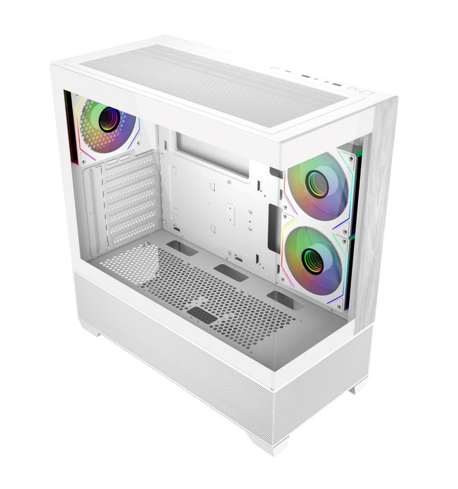 Model Elite 690 má čistý a moderní design a je vybaven dvěma panely z tvrzeného skla na přední a boční straně, které prezentují prémiové komponenty a osvětlení RGB. Přední panel kombinuje přírodní akcent s texturou dřeva se spodním sáním ze síťoviny, což přináší jak estetické teplo, tak efektivní proudění vzduchu. Díky rozsáhlému větrání na horní a spodní straně podporuje skříň univerzální konfigurace ventilátorů a chladičů, které umožňují výkonné vertikální chlazení. Ať už stavíte vysoce výkonnou předváděcí sestavu nebo stylovou stolní sestavu, Elite 690 poskytuje dokonalou rovnováhu mezi funkčností a formou.