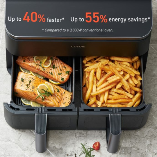 Pokud hledáte způsob, jak připravovat různá jídla současně, aniž byste museli používat více zařízení nebo dělat kompromisy v chuti, pak je pro vás horkovzdušná fritéza Cosori Dual Basket tou správnou volbou. Má dva nezávislé koše, které umožňují připravit dva různé pokrmy najednou, s různým nastavením teploty a času. Cosori Dual Basket využívá technologii 360 ThermoIQ™, která zajišťuje, že vaše jídla budou rovnoměrně uvařená, šťavnatá uvnitř a křupavá zvenčí s použitím malého množství anebo vôbec žádného oleje. Horkovzdušná fritéza Cosori Dual Basket se velmi snadno ovládá a využívá dotykový ovládací panel s intuitivním rozhraním. Díky průhledným okénkům z kvalitního borosilikátového skla na přední stěně fritovacích košů a vestavěnému světlu můžete sledovat své jídlo během přípravy, aniž byste museli fritézu otevírat.
