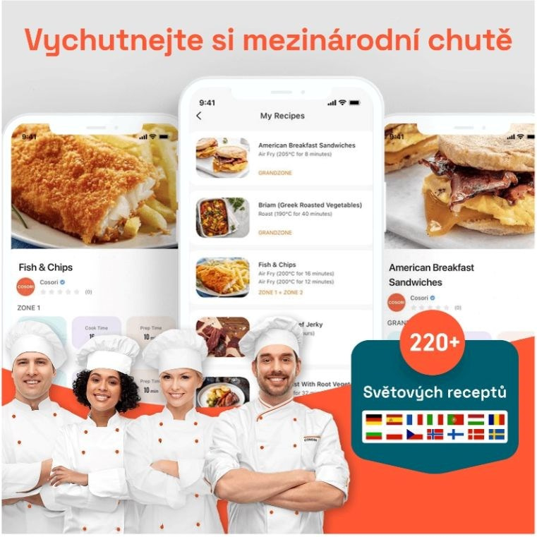Fritéza Cosori Turbo Tower Pro byla navržena v Kalifornii a na jejím vývoji pracoval také tým Cosori kuchařů. V aplikaci najdete přes 200 mezinárodních receptů, které můžete díky jednoduchosti přípravy jídla ve fritéze jednoduše připravit svým blízkým.
