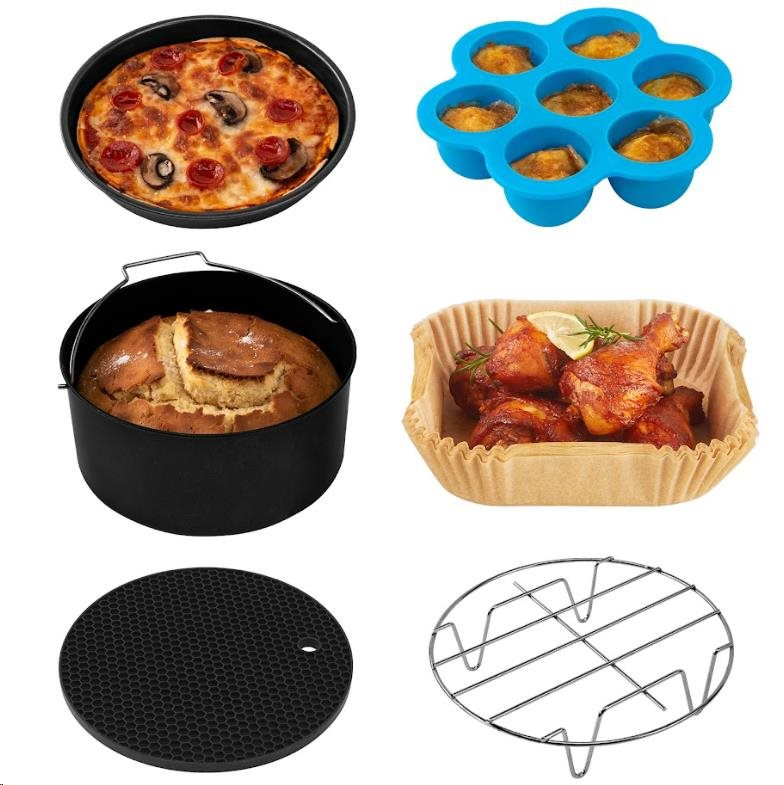 6dílná sada příslušenství 1 ks forma na pečení 1 ks forma na pizzu 100 ks papírových pečících forem, rozměr 20x20x6,5cm 1 ks stojan na napařování 1 ks silikonová podložka 1 ks forma na pečení vajec a muffinů s víkem Prémiová kvalita Veškeré příslušenství lze mýt v myčce na nádobí. Obsahuje materiály bez BPA (Bisphe... více