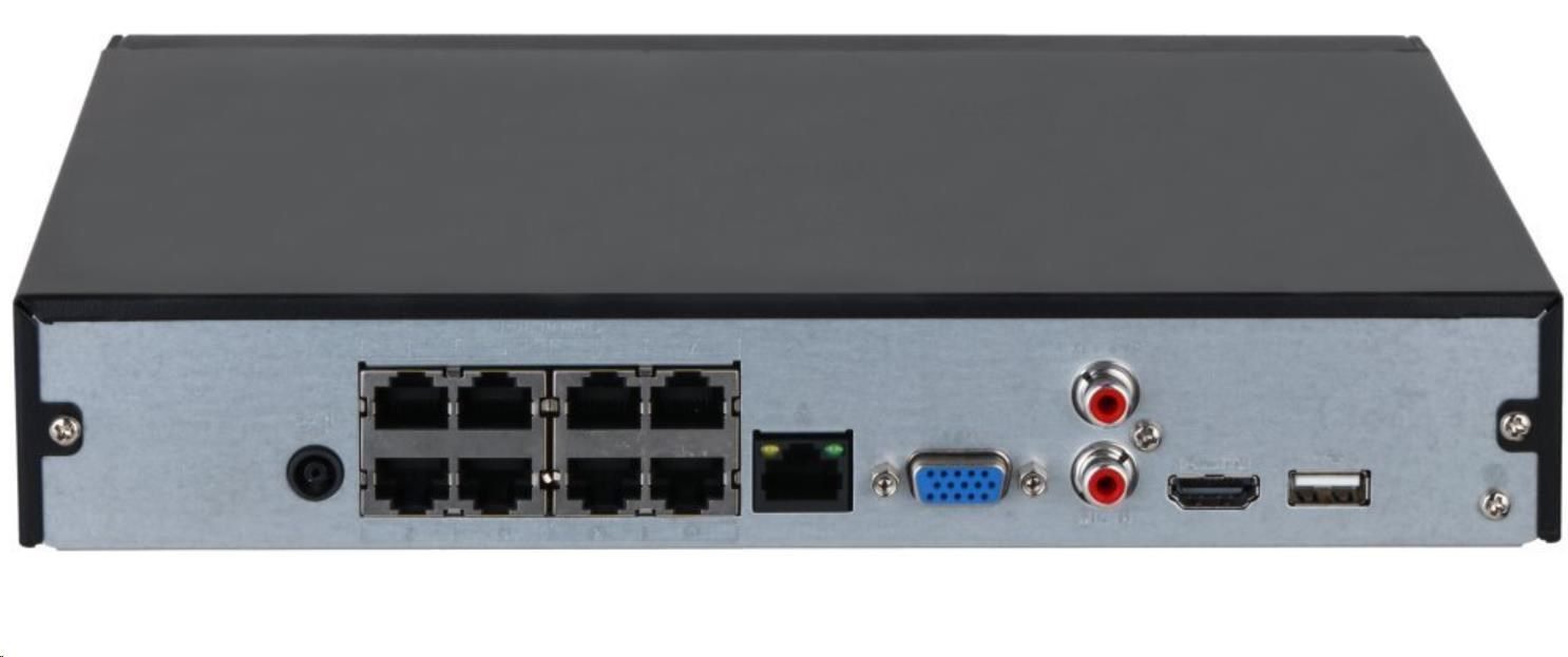 - Rozhraní (porty): 1× RJ-45 LAN (10/100/1000 Mbps), 8× RJ-45 (10/100 Mbps, PoE, IEEE 802.3af/at), 2× USB 2.0, 1× audio vstup (RCA), 1× audio výstup (RCA), 1× HDMI, 1× VGA výstup