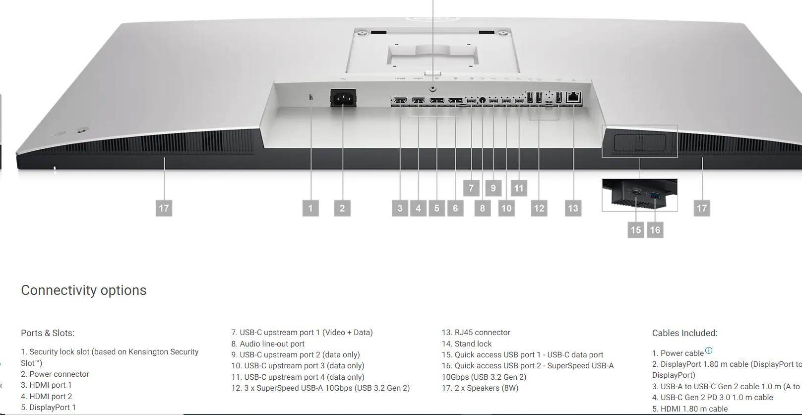 1. Security lock slot (based on Kensington Security Slot™) 2. Power connector 3. HDMI port 1 4. HDMI port 2 5. DisplayPort 1 6. DisplayPort 2 7. USB-C upstream port 1 (Video + Data) 8. Audio line-out port 9. USB-C upstream port 2 (data only) 10. USB-C upstream port 3 (data only) 11. USB-C upstream port 4 (data only) 12. 3 x SuperSpeed USB-A 10Gbps (USB 3.2 Gen 2) 13. RJ45 connector 14. Stand lock 15. Quick access USB port 1 - USB-C data port 16. Quick access USB port 2 - SuperSpeed USB-A 10Gbps (USB 3.2 Gen 2) 17. 2 x Speakers (8W) |
