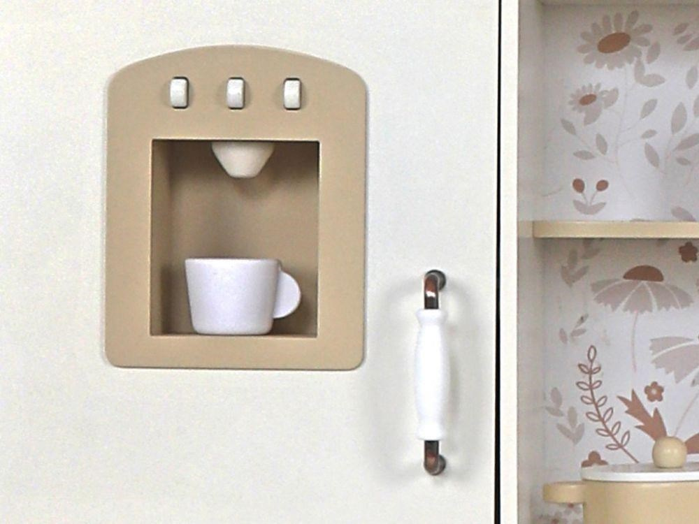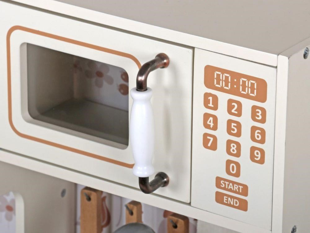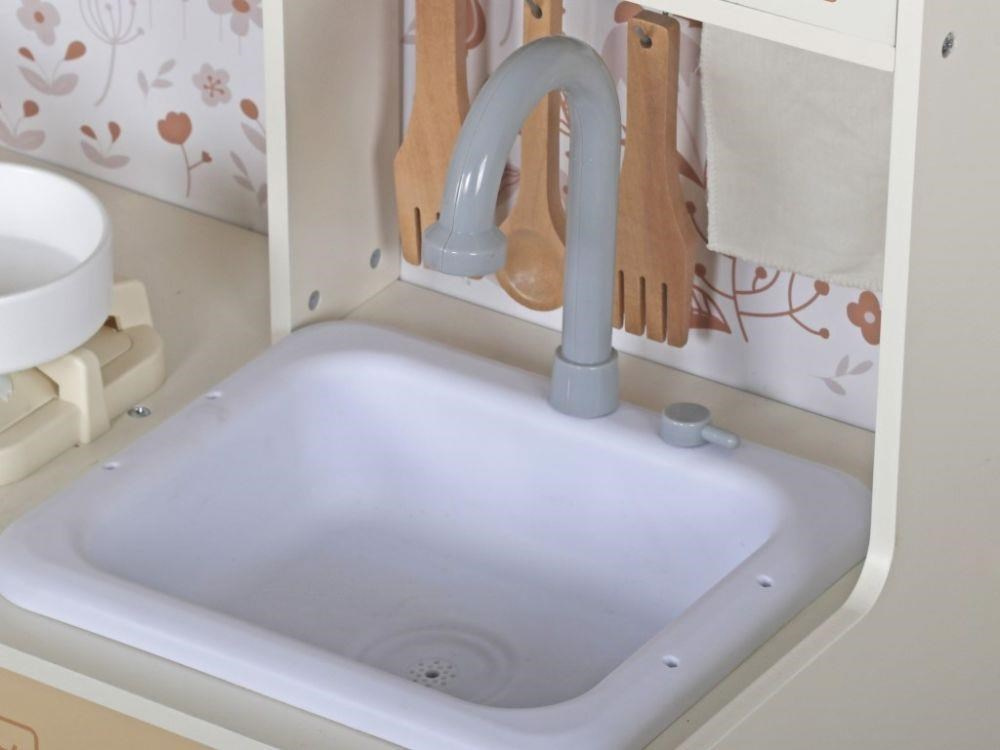 Dětská kuchyňka ve světlých barevných tónech, zdobená květy, je stylovou edukativní hračkou pro děti od 3 let věku. V dřevěné kuchyňce s moderními spotřebiči a tekoucí vodou popustí děti uzdu své fantazii, mohou vařit, péct a ohřívat pokrmy, uvařit kávu a klidně vyprat špinavé prádlo. Jednoduše si vyzkouší dospělácké činnosti bezpečným dětským způsobem. Reálný nádech celé hře dodají zvukové efekty, které vydává sporák nebo vodovodní baterie..