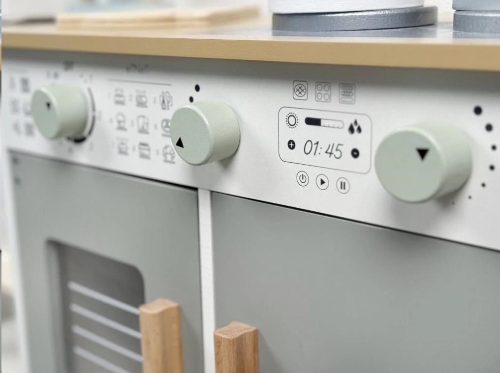 Dřevěná dětská kuchyňka v neutrální barevné kombinaci bílé a šedé barvy, doplněná bohatým příslušenstvím, je místem, kde vaše dítko může popustit uzdu své fantazii a kreativitě. Dětská kuchyňka se spotřebiči i nádobím je edukativní hračkou, která umožní dětem vyzkoušet si vaření, pečení a ostatní dospělácké činnosti bezpečným dětským způsobem. Díky přídavným nožkám (nástavcům) můžete kuchyňku zvednout o 6 cm.