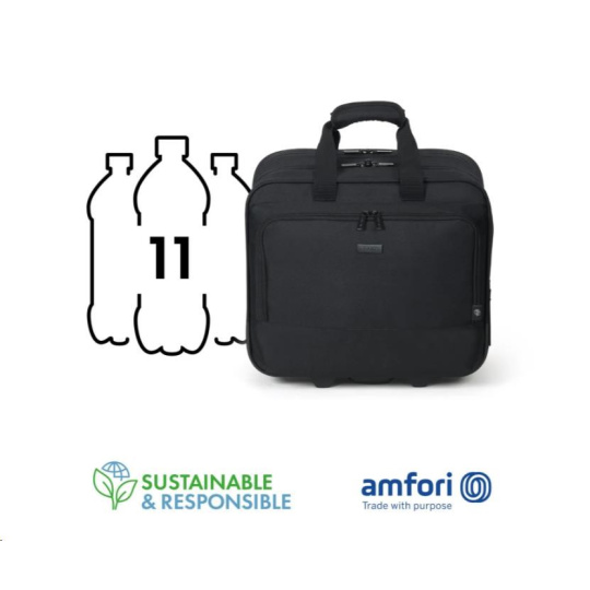 Eco Top Traveller BASE je inteligentní vozík pro profesionály, kteří dbají na životní prostředí. Je navržen pro každodenní použití a vybaven praktickými funkcemi, které vám usnadní život. Váš 13-16" notebook je vysoce chráněn v polstrované hlavní přihrádce. Dokonce i váš tablet s úhlopříčkou až 12,9" můžete bezpečně uložit do polstrované výsuvné kapsy. Velkorysá hlavní přihrádka nabízí úložný prostor pro oblečení a dokumenty. Prostorná přední přihrádka s praktickým a snadno přístupným pracovním místem pro mobilní příslušenství umožňuje uspořádat osobní věci pomocí držáků na předměty, jako jsou pera, vizitky, doklady a smartphone. Díky přihrádce na štítky s adresou je každá cesta bezproblémová a bez stresu. Vyztužená spodní část, kvalitní kolečka, teleskopická rukojeť z prvotřídních materiálů, jakož i odolný, vodu odpuzující hlavní materiál zajišťují dlouhotrvající přepravní komfort. Vozík Roller Eco Top Traveller BASE je pro vás ideální, pokud jste stále na cestách a chcete podpořit recyklaci PET lahví ekologickým vozíkem.