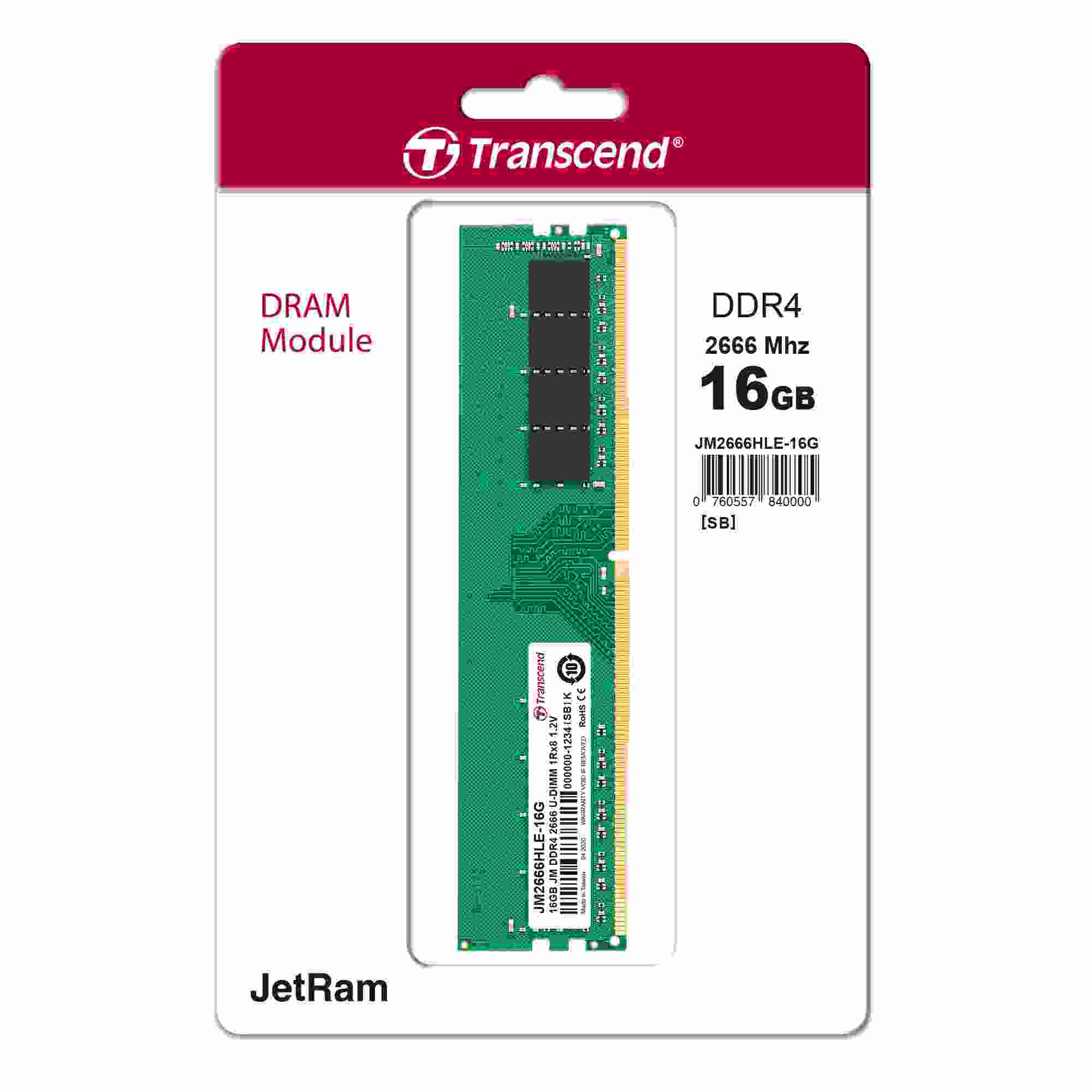 Transcend's JetRam memory modules are manufactured with true ETT grade, brand-name DRAM chips that have passed Transcend's strict screening process and rigorous environmental testing. The modules provide excellent compatibility and fully-tested reliability, which is ideal for PC upgrade at an attractive price. Each memory module is rated at 2666MHz to greatly increase data transmission efficiency by higher bandwidth of up to 21GB/s. Operated at a nominal voltage of just 1.2V, Transcend's DDR4 U-DIMM JetRam memory ensures that both operating temperature and electrical load on the memory controller can be reduced in order to save up to 40% of energy compared to standard DDR3 modules offering 1.5V.