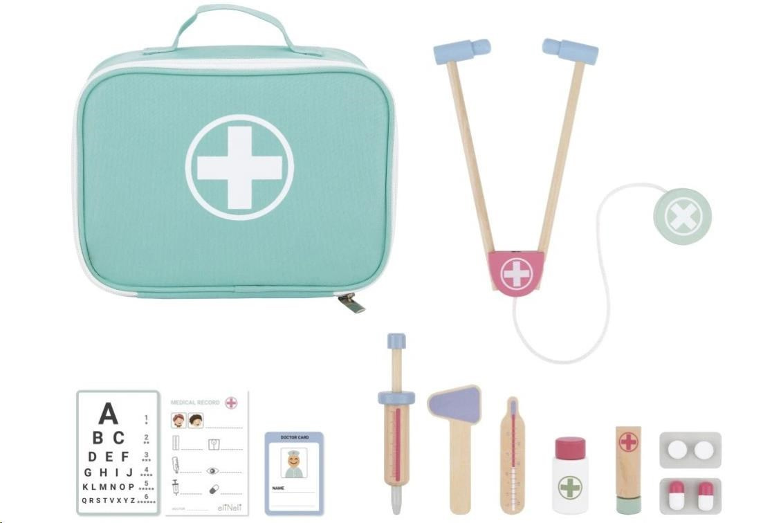 Doktorský set obsahuje: 1 látkovou brašnu, 1 stetoskop, 1 otoskop, 1 teploměr, 1 injekční stříkačku, 1 balení léků, 1 léčivou mast, 4 dřevěné tabletky, oční tabuli v rozměru 15 x 10 cm, jmenovku, vyšetřovací kartu.