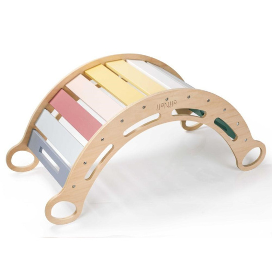 Velká dřevěná montessori houpačka 6v1, v setu se speciálním oboustranným prknem a židlí, vám umožní vytvořit duhový set dětského nábytku (stůl se židlí) téměř kdekoliv. Stejně snadno tento set proměníte v malé dětské hřiště se skluzavkou nebo lezeckou stěnou. Multifunkční montessori houpačka max umožní dětem příjemně se pohoupat, může být prolézačkou, skluzavkou, skrýší, mostem, s dalšími částmi setu stolečkem nebo dětským hřištěm. Pastelový set je vhodný pro děti již od 1 roku..