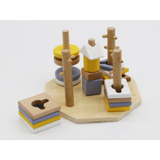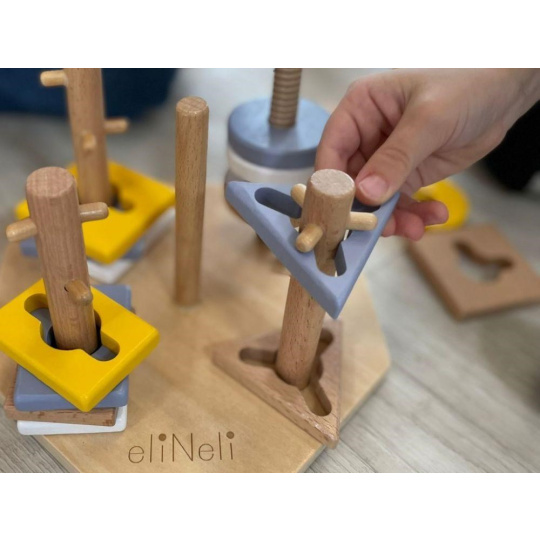 Úžasná motorická hračka, dřevěná navlékací hra s geometrickými tvary, přirozeným způsobem rozvíjí u děti motorické dovednosti, koordinaci očí a rukou, představivost, učí dětí soustředit se. Navlékací tvary v krásných neutrálních barvách děti nasazují na dřevěné kolíky, které však nejsou zcela hladké a dětem navlékání ztěžují různými výstupky. Někdy tato hra vyžaduje spoustu trpělivosti..