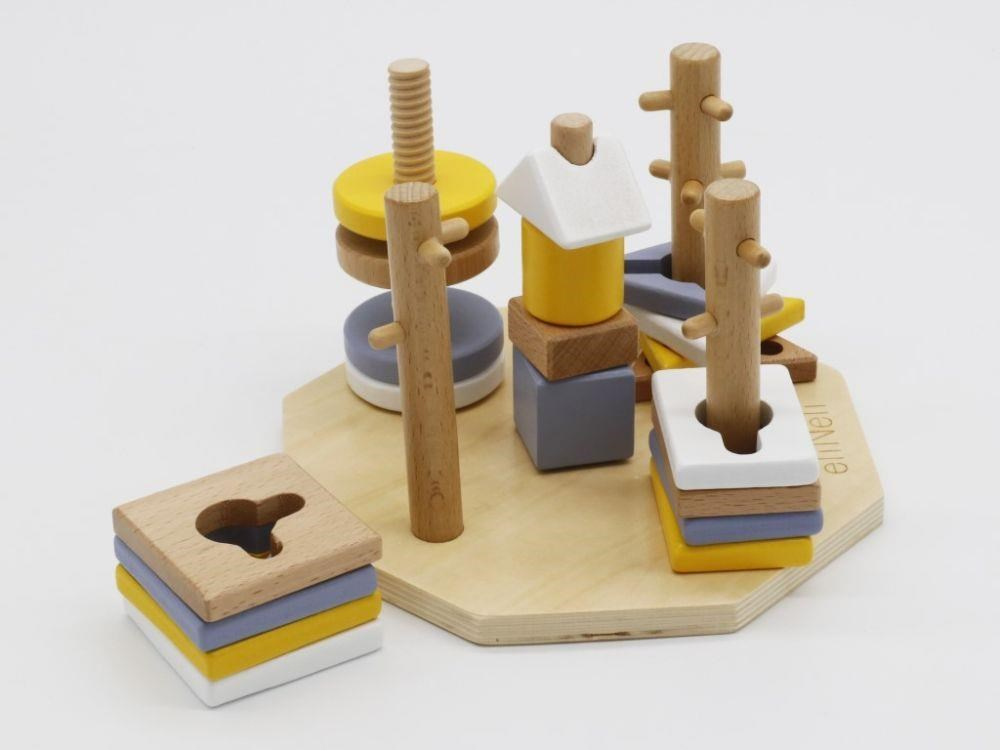 Úžasná motorická hračka, dřevěná navlékací hra s geometrickými tvary, přirozeným způsobem rozvíjí u děti motorické dovednosti, koordinaci očí a rukou, představivost, učí dětí soustředit se. Navlékací tvary v krásných neutrálních barvách děti nasazují na dřevěné kolíky, které však nejsou zcela hladké a dětem navlékání ztěžují různými výstupky. Někdy tato hra vyžaduje spoustu trpělivosti..