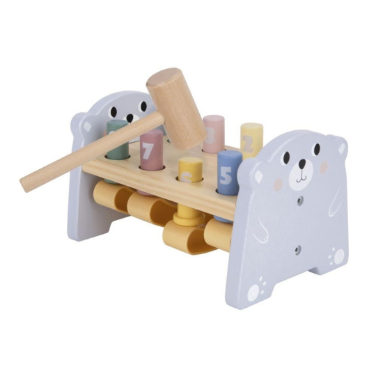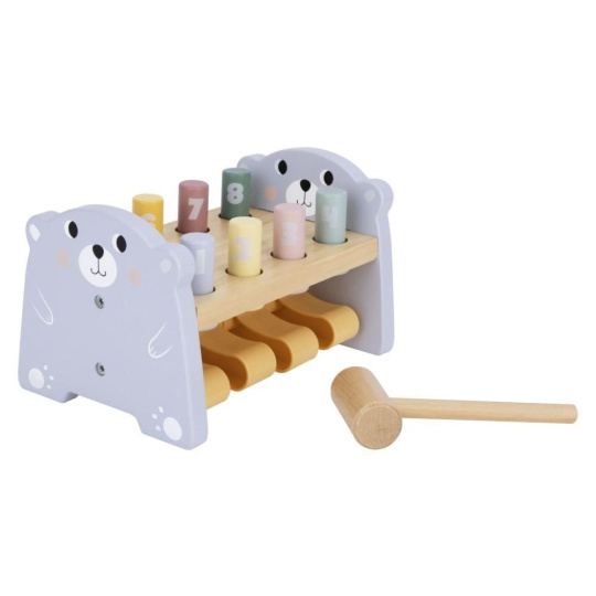 Zatloukačka pro děti je klasickou dřevěnou hračkou, která potěší každé dítko. Dřevěná zatloukačka v krásných barvách, s roztomilým medvídkem, s očíslovanými válečky a malou vychytávkou rozvíjí dětské dovednosti, naučí děti poznávat barvičky i číslice..