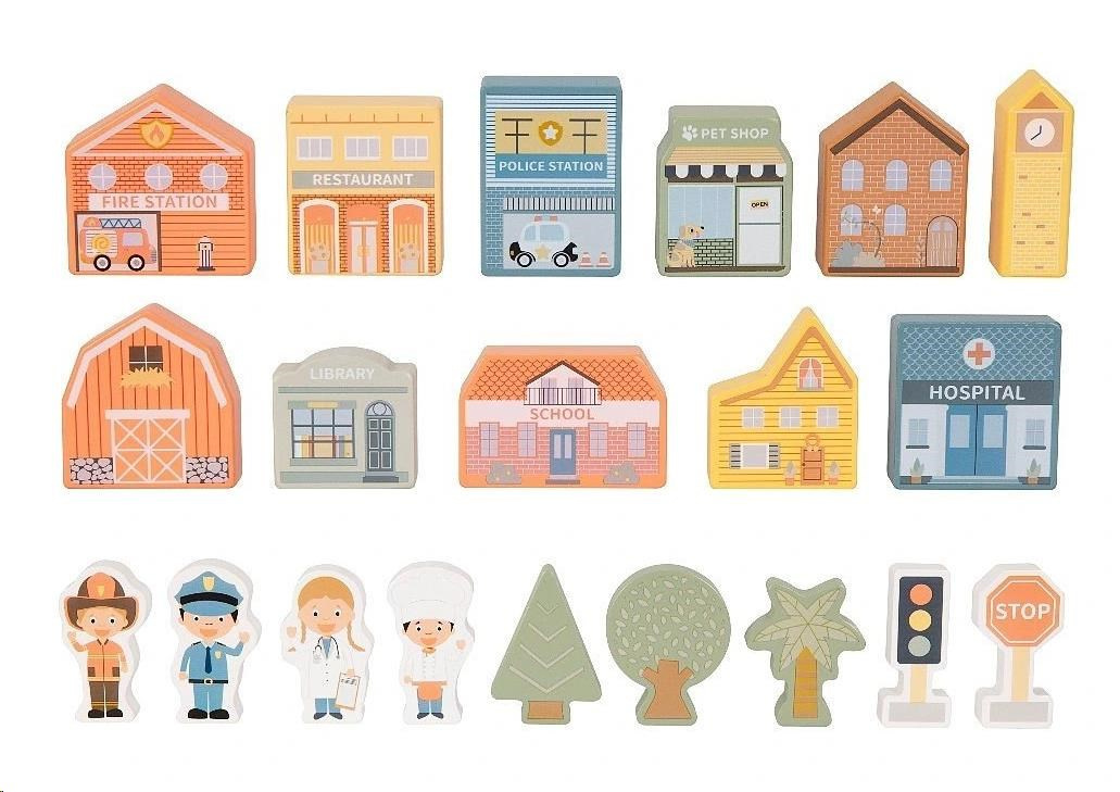 - Obsah balení: 20 dřevěných kostek (domečky, postavičky, stromy a dopravní značky).