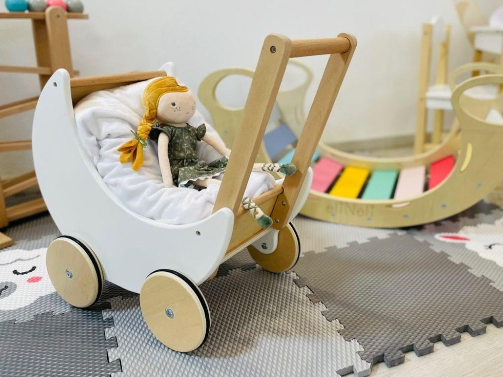 Designový kočárek ve tvaru měsíčku, vyrobený z přírodního dřeva, je jako stvořený pro krátké i dlouhé procházky, uspávání oblíbených panenek nebo plyšáků. Dřevěný kočárek dobře padne do dětské ručky, snadno se řídí a ovládá. Kočárek pro panenky zaparkovaný v dětském království vaší princezny je současně i krásnou dekorací..