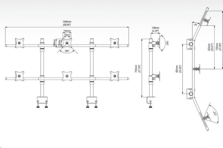Technické údaje: nosnost 60kg na monitory s úhlopříčkou 13" až 27" VESA norma 75x75mm a 100x100mm - uchycení u 99% monitorů nastavení vzdálenosti monitorů od středního nastavení sklonu +/- 80st. funkce pivot - nastavení monitoru vodorovně, svisle nebo pod úhlem uchycení na stůl ve dvou bodech atest kvality a funkčnosti TUV velmi snadná a rychlá montáž barva stříbrná nebo černá záruka 10 let.