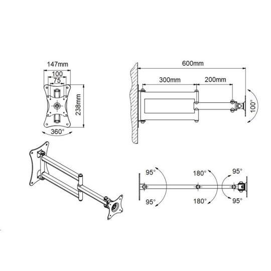 Kompletní specifikace Držák Tv nebo monitoru EDBAK GD26 Profesionální držák na televizi nebo monitor 15-43", otočný, sklopný, délkově nastavitelný, funkce pivot, VESA 75x75 a 100x100, nosnost 15kg Nástěnný držák vynikající kvality a robustní konstrukce pro zavěšení televize nebo monitoru 15-43". Držák podporuje VESA standardy 75x75 a 100x100, je možné zakoupit VESA rozšíření na 200x100 a 200x200. Po zavěšení Tv na držák můžete obrazovku otáčet na obě strany i kolmo ke zdi, naklápět nahoru a dolů, přetočit ji na šířku nebo na výšku. Vzdálenost od zdi lze nastavit v rozmezí 90-600mm. Držáky GD26 můžete zakoupit ve třech barevných variantách: černý, stříbrný nebo bílý. Nosnost držáku je 15kg. Záruka 5 let. Polohovatelný otočný sklopný a délkově nastavitelný držák na LCD LED televizory a monitory - EDBAK GD26 / drzakyastolky.cz Technické údaje: nosnost 15kg podporuje VESA standardy 75x75 a 100x100 možnost rozšíření VESA standardu na 200x100 nebo 200x200 za příplatek doporučená úhlopříčka televizoru nebo monitoru 15-43" nastavitelná vzdálenost od zdi minimální vzdálenost 90mm maximální vzdálenost 600mm funkce PIVOT - možnost otáčení obrazovky kolem osy otáčení do stran +/- 90° náklon +10° až -50° (lze i obráceně, dle montáže držáku) snadná a rychlá montáž profesionální kvalita ocelová konstrukce barva - černá, stříbrná nebo bílá záruka 5 let.