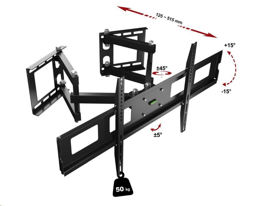 Držák Tv do rohu Fiber Novelty FN13 Speciální držák pro zavěšení Tv do rohů ale i na rovné stěny, na Tv 43-80", otočný +/- 60°, sklopný +/- 15°, vzdálenost od zdi 125-515mm, korekce roviny +/- 5°, instalační materiál, VESA standardy 75x75 až 800x400, nosnost 50kg Robustní televizní držák umožňující připevnění televizoru LCD LED a PLAZMA do rohů místností ale i na rovné zdi. Při instalaci do rohů díky uchycení na obou stěnách televizi snadno nastavíte do ideální pozice. Doporučená velikost televizorů je 43" až 80". Televizor je možné sklopit a to až o 15°. Podpora VESA 75x75 až 800x400, nosnost 50kg. V případě instalace na rovnou stěnu je nastavitelná vzdálenost 125-515mm a otáčení do stran +/- 45°, při instalaci do rohů se vzdálenost a otáčení mění vzávisloti od míry rozevření nástěnných ramen. Součástí televizního držáku je i integrovaná vodováha pro přesnou montáž a veškerý instalační materiál. Záruka 5 let. Televizní držák pro uchycení do rohu místnosti Fiber Novelty FN13 Technické údaje: nosnost 50kg podpora VESA standardu 75x75 až 800x400 ideální na televize s úhlopříčkou 43" až 80" otáčení do stran +/- 45° možnost náklonu +/- 15° vzdálenost od zdi 125 - 515mm korekce roviny +/- 5° integrovaná vodováha poctivá ocelová konstrukce instalace do rohů místností i na rovné stěny snadné nastavení televizoru do požadované polohy záruka 5 let.