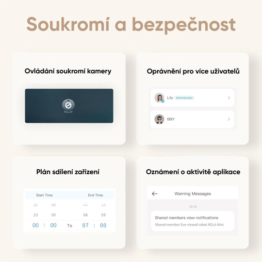 - Vzdálené videohovory – umožňuje volat mezi uživateli robota a aplikace, ideální pro kontakt s rodinou.
