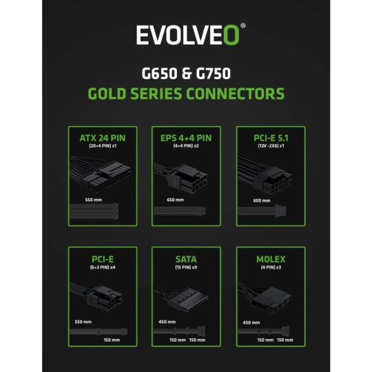EVOLVEO G650 zdroj 650W, 80+ GOLD, ATX 3.1, aPFC, 140 mm ventilátor