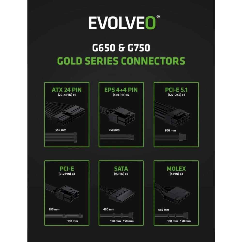 EVOLVEO G650 zdroj 650W, 80+ GOLD, ATX 3.1, aPFC, 140 mm ventilátor, záruka 3 roky, bílý