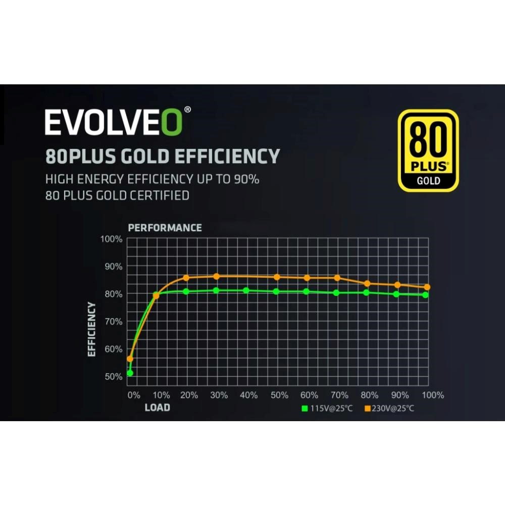 PC zdroj EVOLVEO G650-WH je hrdým držitelem certifikace 80 PLUS Gold, která slibuje až 92% účinnost (při běžném 50% zatížení). Minimální ztráty energie a nízké zahřívání jdou přitom ruku v ruce s tichým chodem 140mm HDB ventilátoru – ten má mezi hřídelí a ložisky speciální olejovou vrstvu a jeho tření je nepatrné, takže hlučnost zůstává na minimu. S tímto zdrojem vás zkrátka hučení ventilátoru neruší – slyšet je jen svištění kol vaší formule nebo řinčení zbraní vaší armády.