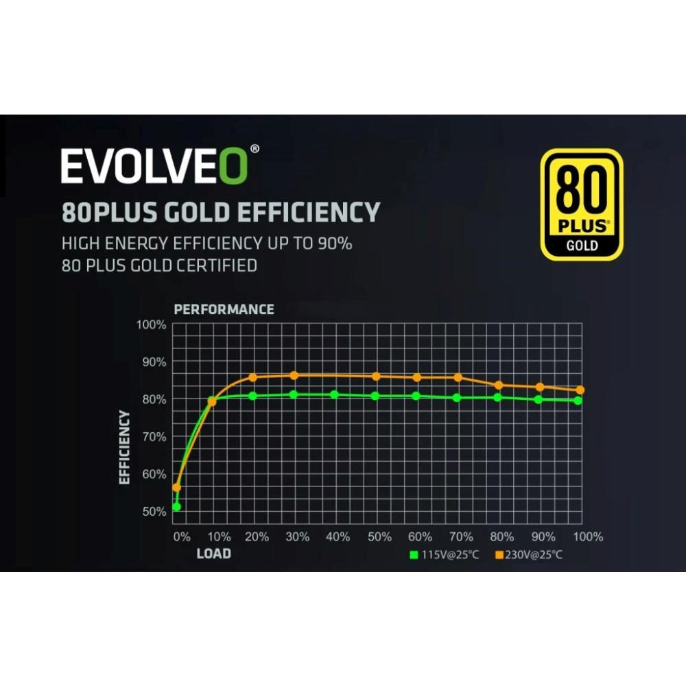 PC zdroj EVOLVEO G850-BK je hrdým držitelem certifikace 80 PLUS Gold, která slibuje až 92% účinnost (při běžném 50% zatížení). Minimální ztráty energie a nízké zahřívání jdou přitom ruku v ruce s tichým chodem 140mm HDB ventilátoru – ten má mezi hřídelí a ložisky speciální olejovou vrstvu a jeho tření je nepatrné, takže hlučnost zůstává na minimu. S tímto zdrojem vás zkrátka hučení ventilátoru neruší – slyšet je jen svištění kol vaší formule nebo řinčení zbraní vaší armády.