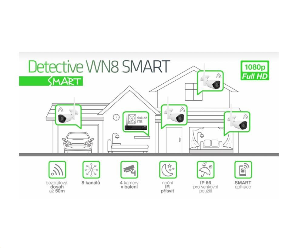 8 kanálový kamerový systém EVOLVEO Detective WN8 SMART je ideální řešení pro monitorování a bezpečnost vašeho domu, kanceláří, skladu nebo firmy. Systém můžete využít doopravdy všude díky bezdrátové technologii pracující na frekvenci 2,4GHz a vlastním privátním protokolu. Dosah kamer je v zástavbě 15-25m od hlavní jednotky. V otevřeném prostranství až 50m - mezi anténou hlavní jednotky a kamerou nesmí být žádná překážka a nesmí být v okolí žádné elektronické zarušení. Kamery jsou přednastavené a předem spárované s NVR jednotkou. Jeho čistý obraz jak ve dne tak v noci využijete pro ochranu a monitorování nejen vaše rodinného domku nebo firmy, ale i pro dozor nad prodejnou nebo pro dohled nad veřejným prostranstvím. Veškeré události se nahrávají přímo na pevný disk, který vložíte do hlavní jednotky, a tak máte vaše data plně pod kontrolou. K záznamu máte přístup pomocí mobilní aplikace pro iOS a Android, nebo iCMS programu pro OS WIndows. Záznam lze také prohlížet na monitoru připojeném přímo do NVR jednotky pomocí HDMI nebo VGA kabelu.