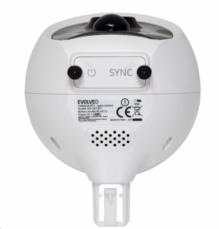 Náhradní kamera určená pro rozšíření instalace EVOLVEO Detective BT4. Kamera je vybavená akumulátorem s 5000mAh kapacitou. Pod krytkou se nachází USB-C konektor pro nabíjení a tlačítko pro zapnutí/vypnutí a párovací režim. Kamera je vybavená nočním IR přísvitem a PIR čidlem pro rozeznání pohybu. Součástí kamery je i mikrofon a reproduktor pro obousměrnou hlasovou komunikaci.