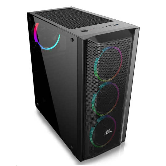 Herní ATX midi tower s instalovanými 4x RGB rainbow 120 mm ventilátory, které se ovládájí pomocí LED tlačítka na horní straně ovládacího panelu. Čelní mřížka přes celý přední kryt zajišťuje efektivní proudění vzduch. Levá strana skříně obsahuje bočnici z tvrzeného skla. Skříň je určená pro základní desky podporující platformu Intel i AMD. Mimo formátu ATX je kompatibilní i s formátem Micro ATXa Mini ITX. Napájecí zdroj se umísťuje do dolní části skříně. Spodní mřížka je osazena vysouvacím prachovým filtrem, horní prachový filter je uchycený magnety a je odnímatelný.