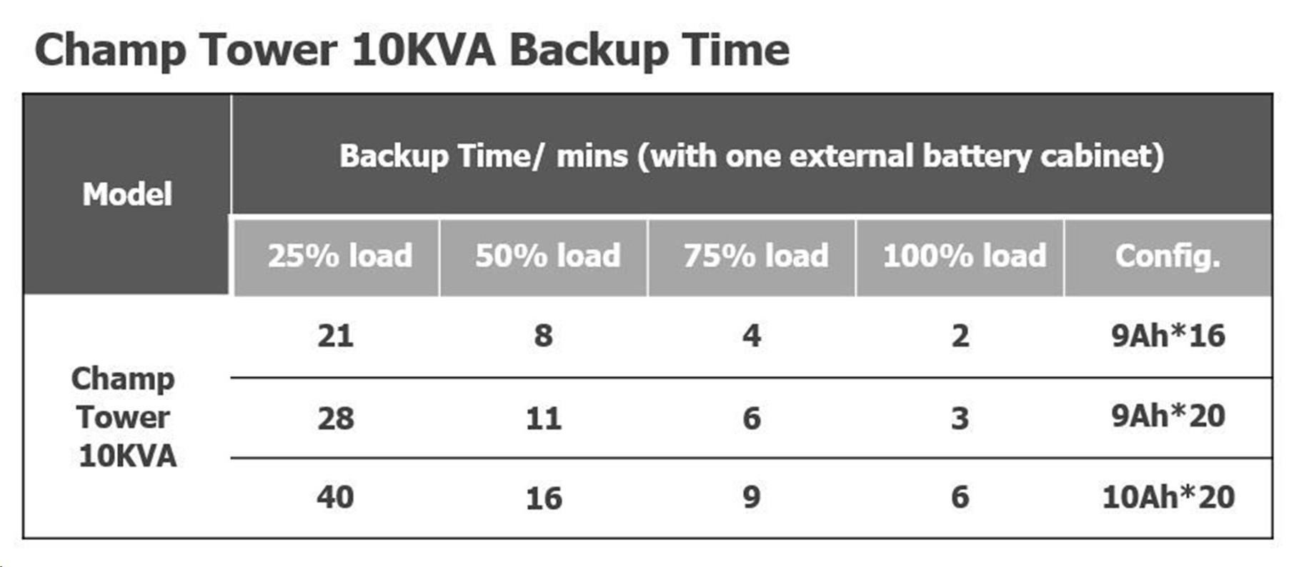 | Backup time - 1x Battery Bank (20pcs 9Ah) | |