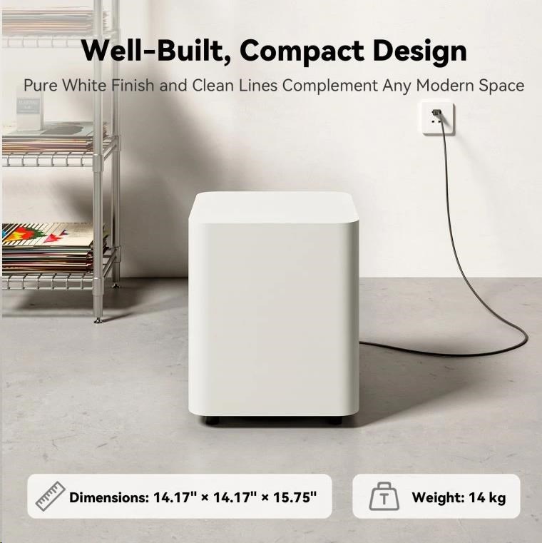 Aktivní subwoofer s 10" down-firing basovým reproduktorem, 200W Class-D zesilovač (špičkově až 500 W). Dvojité zadní bass-reflex porty, tuhá 14kg konstrukce. Vstupy: RCA a LFE. RCA výstup pro propojení dalšího subwooferu, nastavitelná fáze 0°–180°, crossover 40–180 Hz, dva DSP EQ režimy. Rozměry 36 × 36 × 40 cm. Součást balení: napájecí kabel 1,8 m, uživatelský manuál..