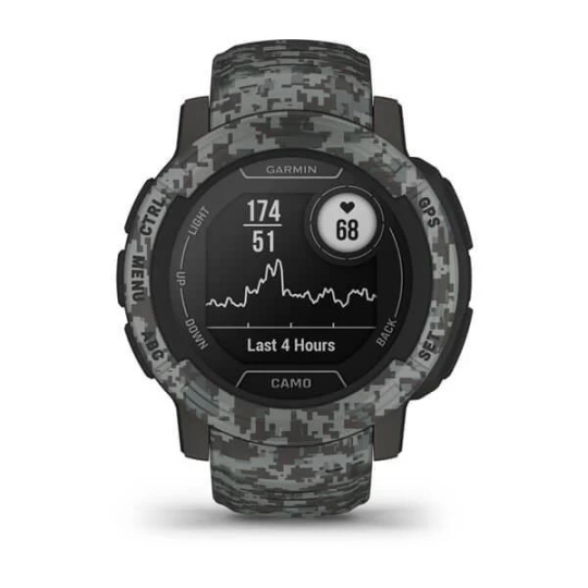 Hodinky Garmin Instinct 2 Camo jsou charakteristické svým osobitým vzhledem a výrazným kamuflážním vzorem. Jsou k dispozici vve dvou velikostech a více barevných variantách. Všechny varianty mají společné charakteristické vlastnosti jako nízkou hmotnost, vysoce kontrastní displej nebo extrémní výdrž a odolnost.